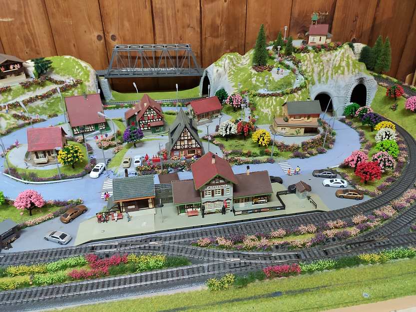Am Rand des Spielbereichs stehen zwei kleine Modellbahnanlagen, wo jeweils ein Kind den Zug fahren lassen kann.